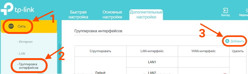 - Выберите раздел "Сеть", пункт "Группировка интерфейсов" и нажмите кнопку "+ Добавить"