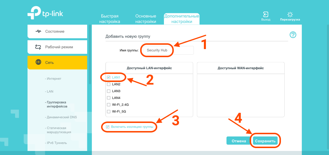 - В появившемся окне придумываете название для группы (например, Security Hub), установите галочку на LAN (например, LAN 1), к которому подключен контроллер Security Hub или модуль LAN (ПАК Астра), установите галочку "Включить изоляцию группы" .