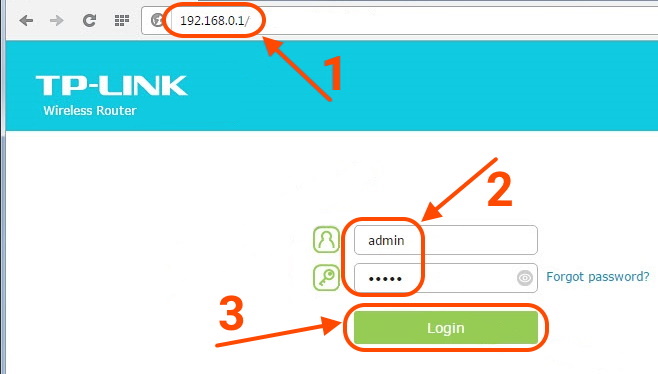 - В адресной строке Вашего браузера введите IP адрес маршрутизатора (по умолчанию 192.168.0.1) и авторизуйтесь (см. РЭ на роутер)