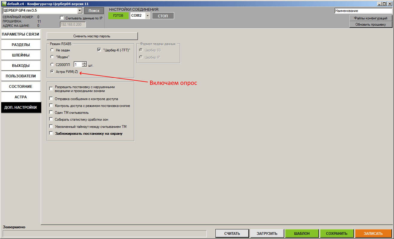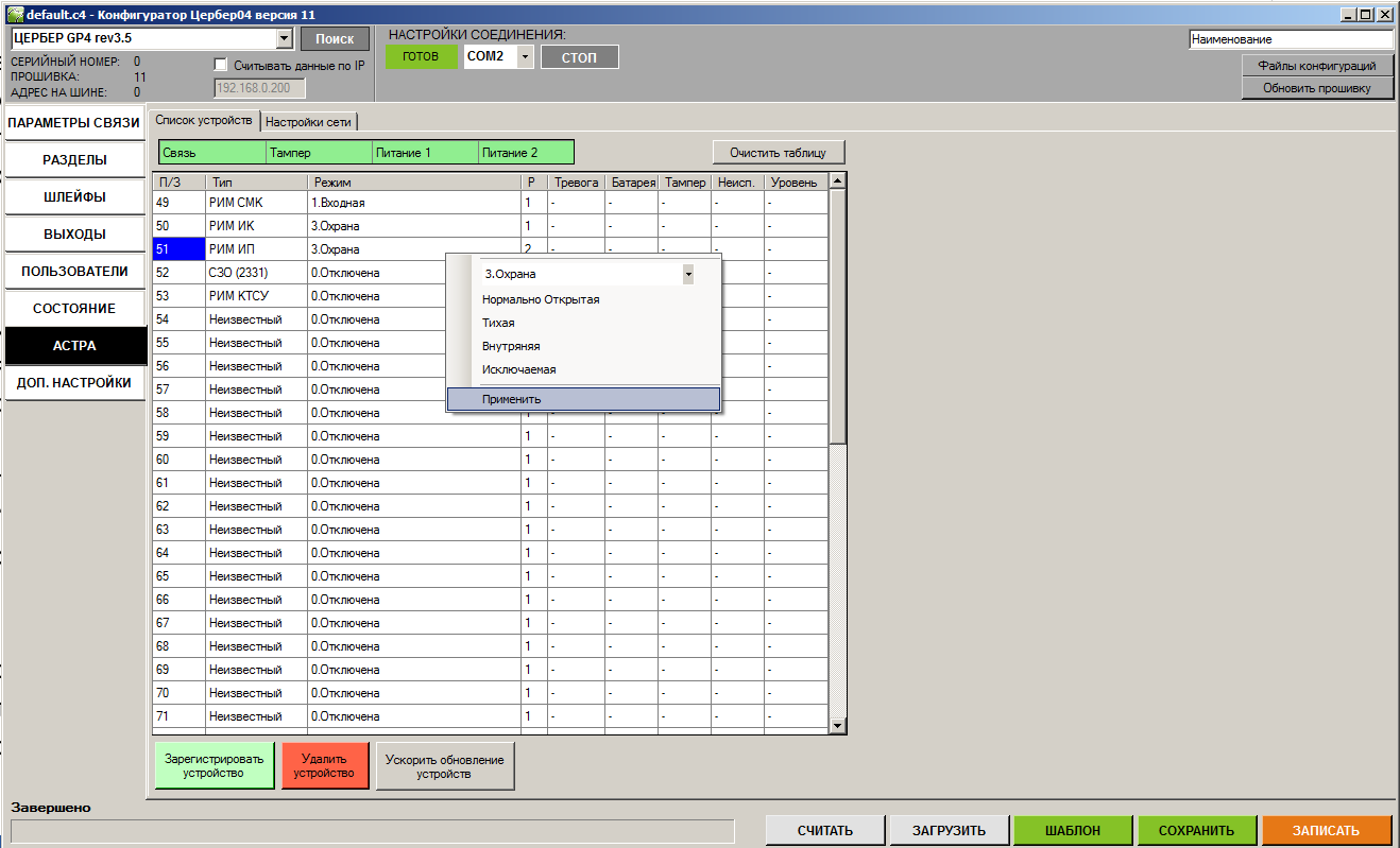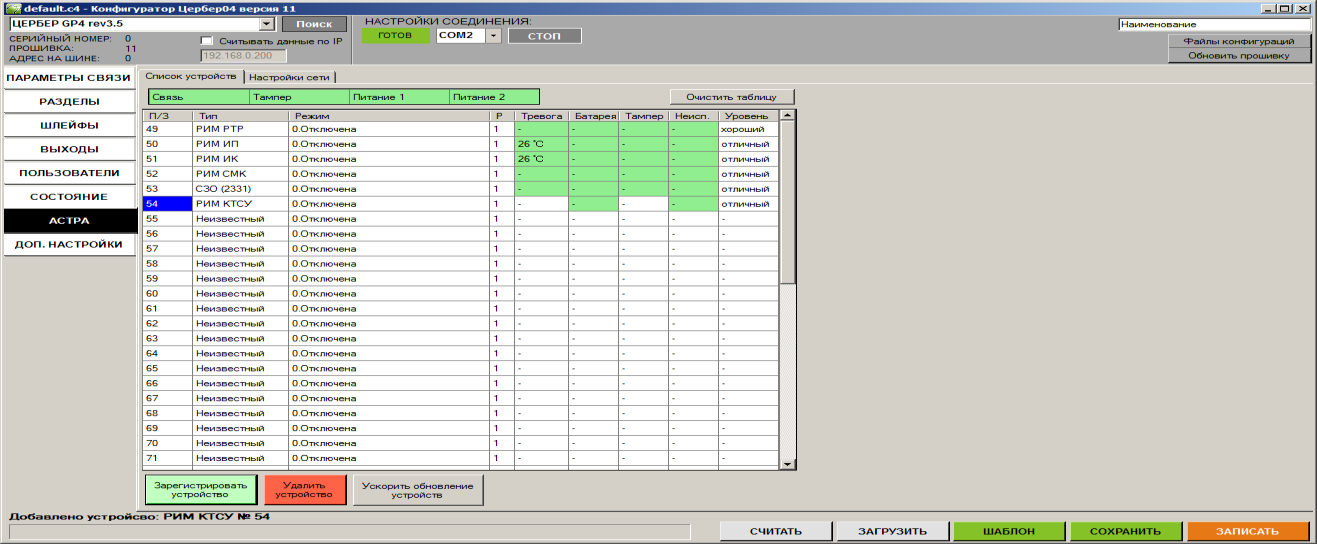 Поддержка беспроводных устройств “Астра” реализована в приборах “Цербер-LP4”, “Цербер-RP4” версии 3.0 и выше, для “Цербер-GP4” версий 3.4 и выше. Конфигуратор не ниже версии 11.
