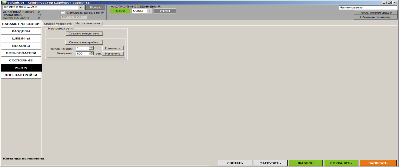Астра-Zитадель может использовать шестнадцать рабочих каналов с шагом пять МГц. После выбора нужной литеры/канала нажимается кнопка “Создать новую сеть”. Будет выведено меню уведомлений о создании новой сети. Подтверждение команды производится нажатием кнопки “ОК”. Далее прибор отправляет команду радиорасширителю, и начнется создание сети. Каждая из сетей использует свой набор технических параметров, автоматически создаваемый в процедуре "создания сети" (номер радиоканала, ключи шифрования, и т.п.). Дождаться окончания процесса создания новой сети, в конфигураторе строка состояния высветится “команда выполнена” (Рис.4.).