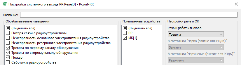 Выход "Пожар" (Relay2) программируется в режим работы "Пользовательский". В состоянии "Норма" - "Разомкнут". В состоянии "Нарушение" - "Замкнут".