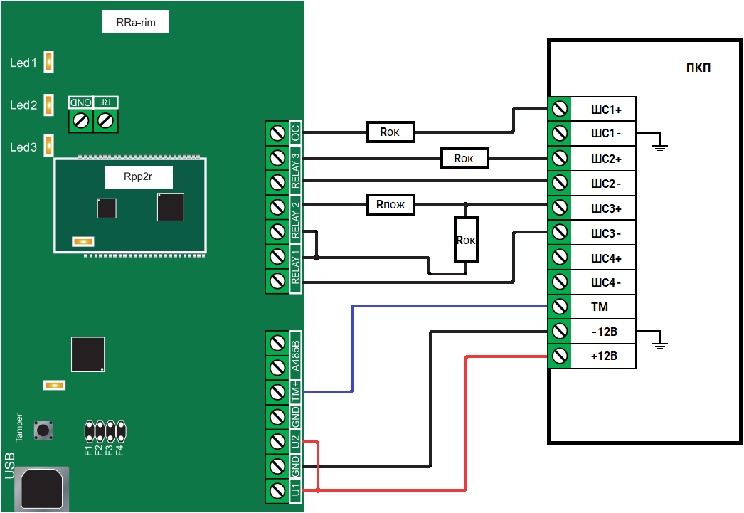 Rок - оконечное сопротивление в шлейфе (номинал см. в РЭ на ПКП)