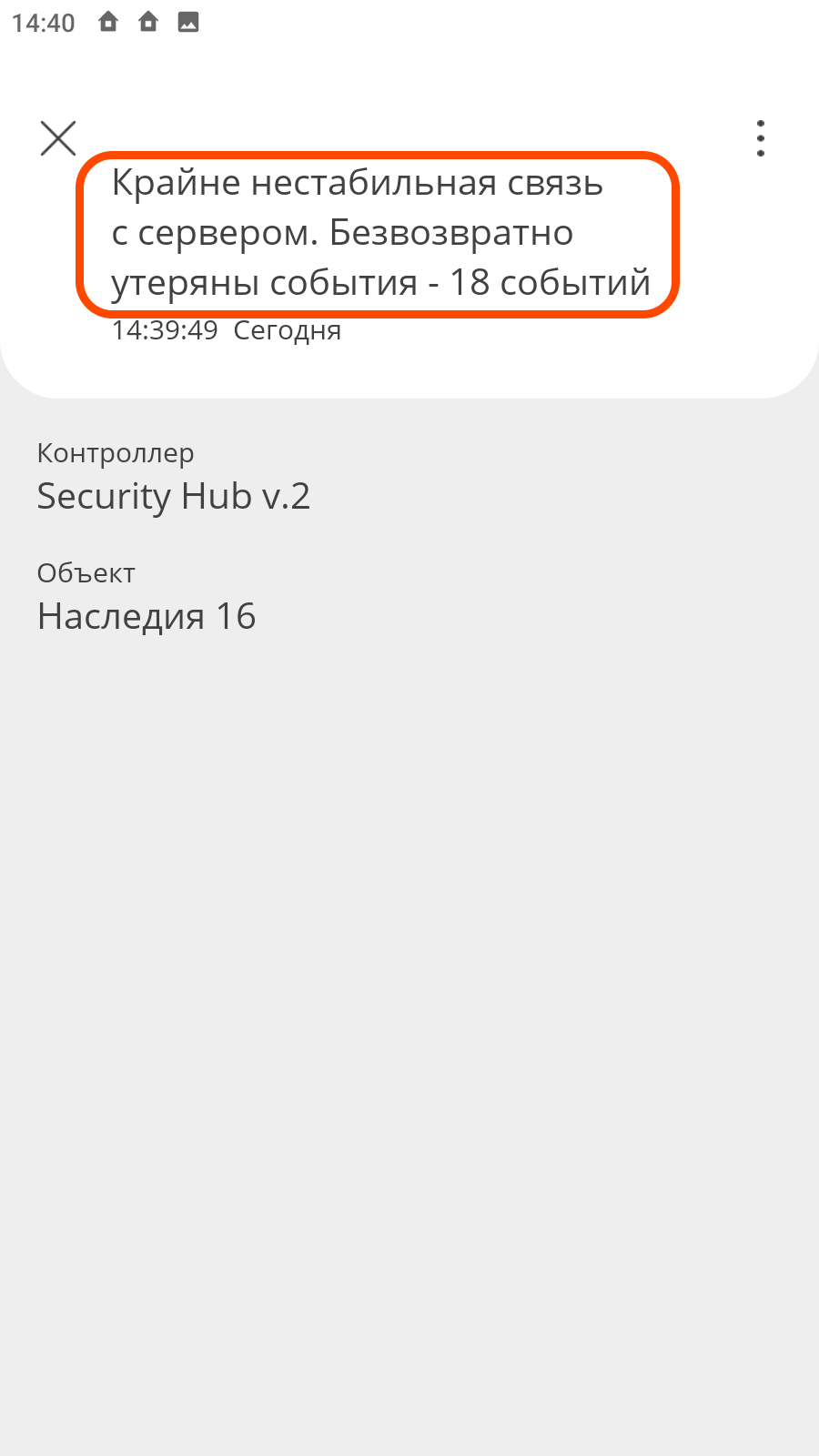 Во время длительного отсутствия связи с сервером или нестабильной связи с сервером, встроенный буфер событий контроллера может быть переполнен, тогда система выдает данное уведомление.