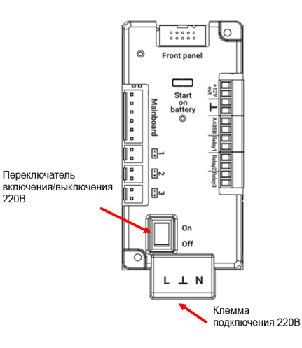 МИП обеспечивает режим «холодный старт» (включение и питание устройств от АКБ при отсутствии сетевого напряжения 220 В). Включение режима выполняется кнопкой «Start on battery».