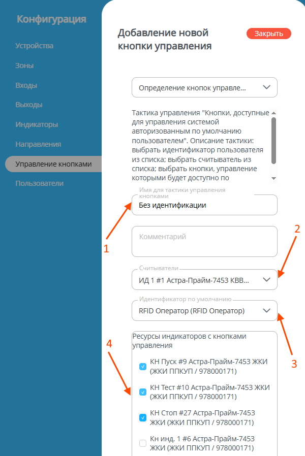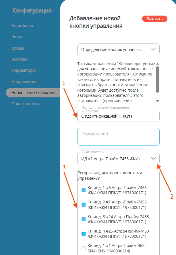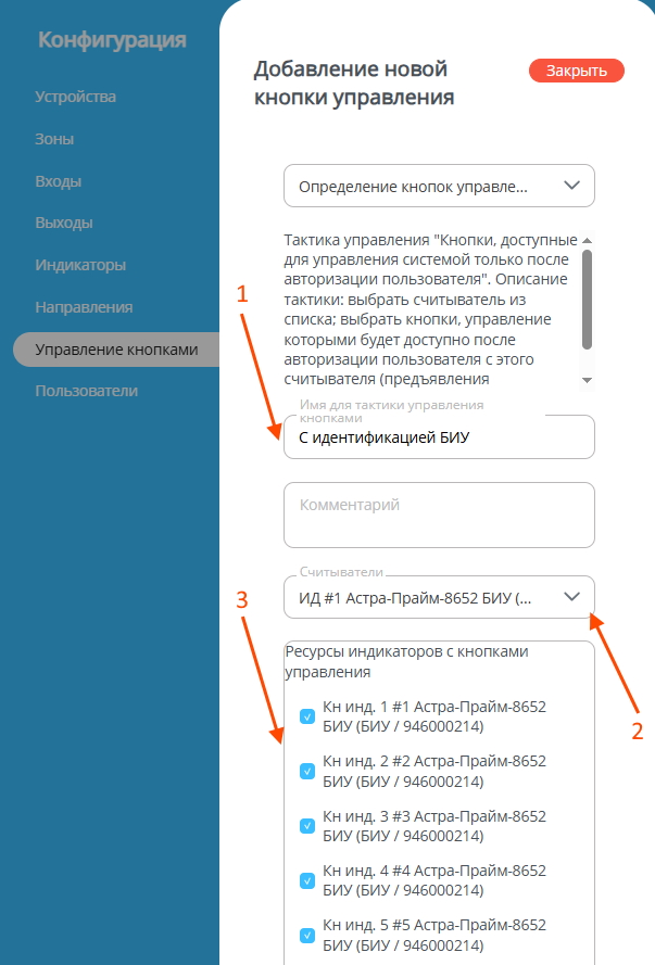 Если в системе используется Астра-Прайм 8652 БИУ, под его индикаторы создается отдельная группа кнопок, чтобы идентификатор корректно работал на обоих считывателях.