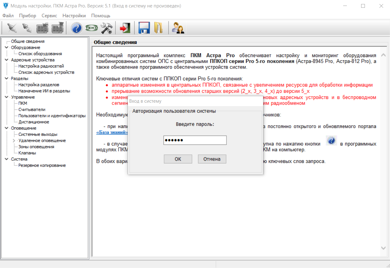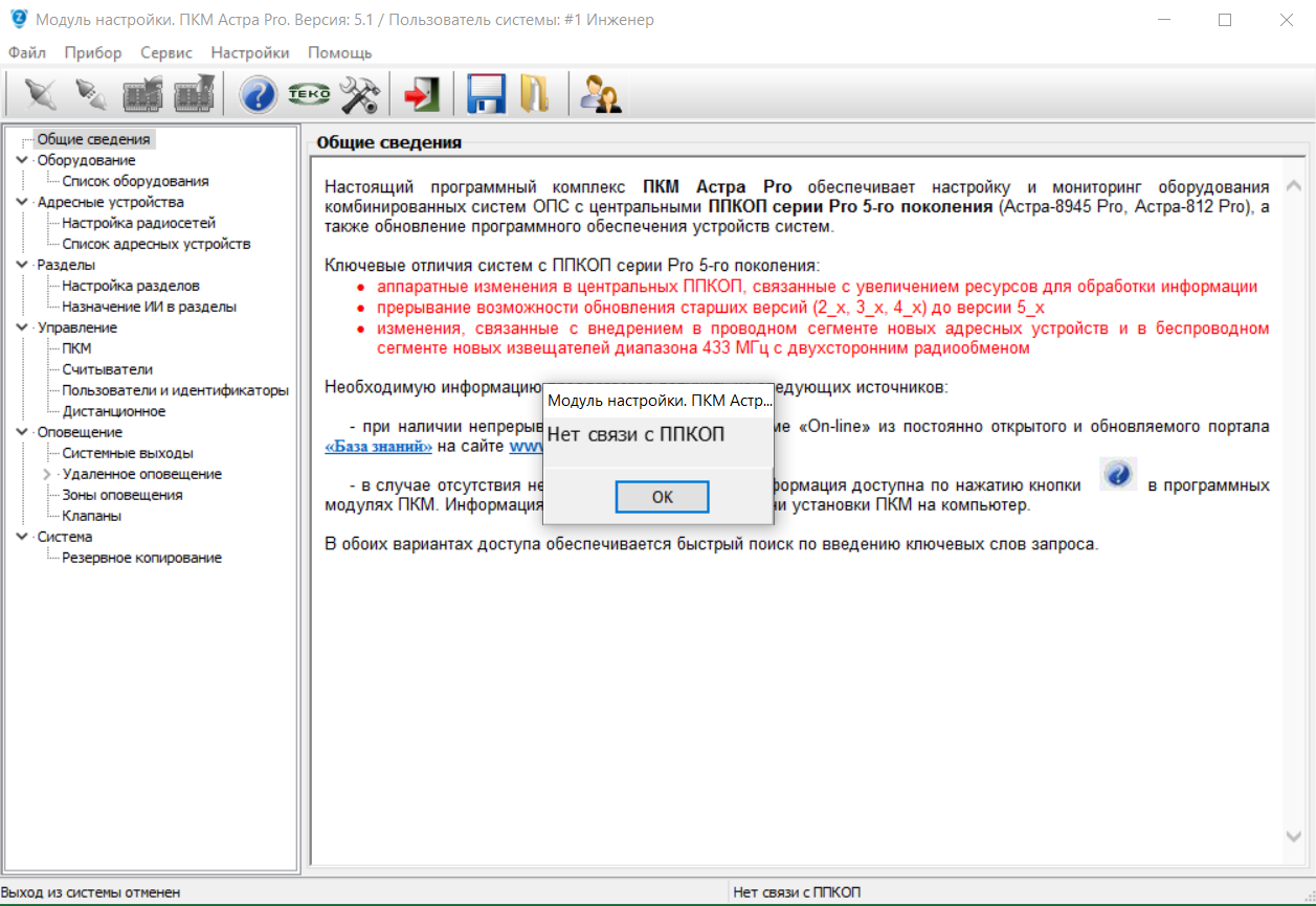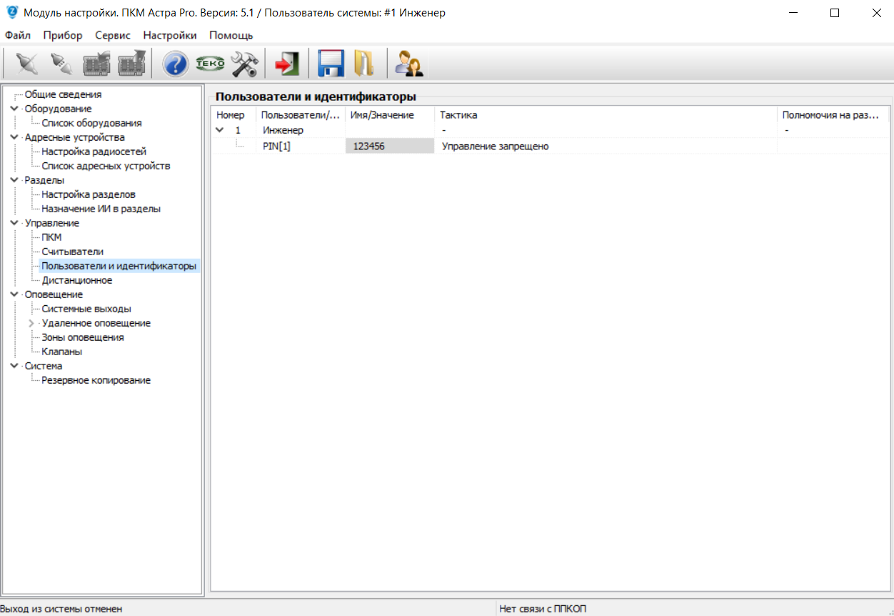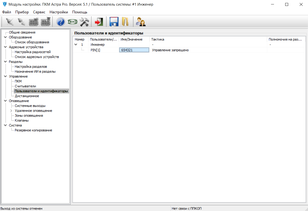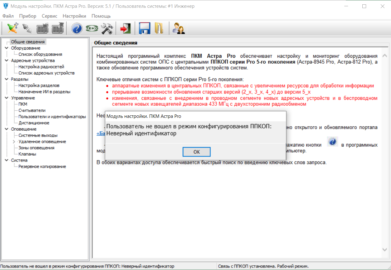 Сообщение: "Пользователь не вошел в режим конфигурирования ППКОП: Неверный идентификатор", нажать ОК