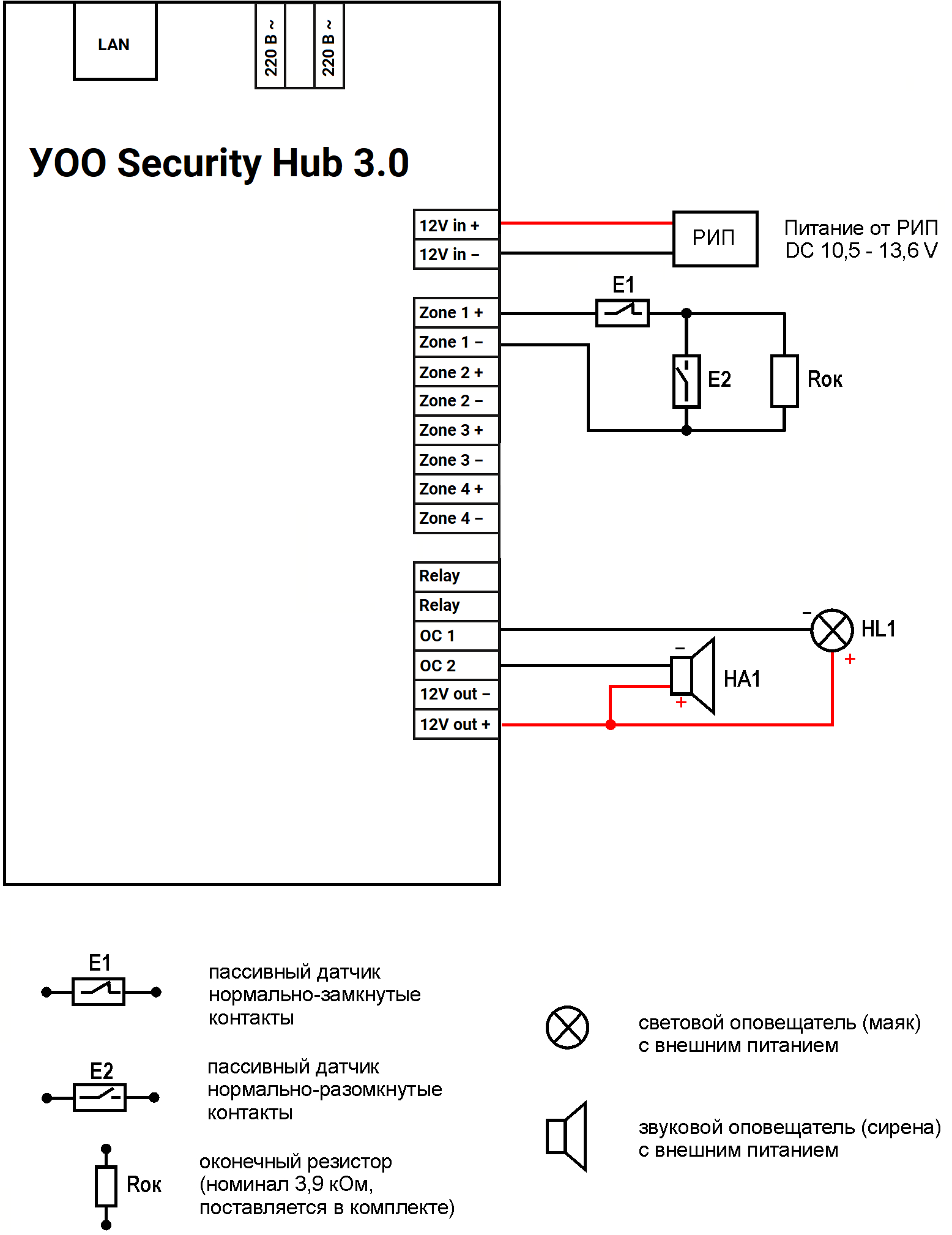 Подключение проводных оповещателей и ШС охранного/технологического типа: