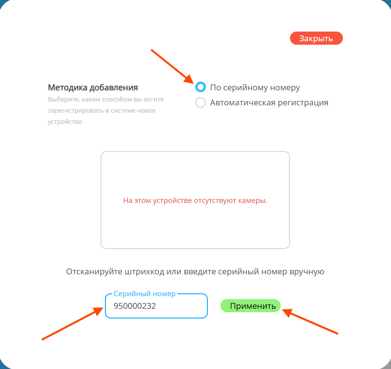 - При наличии на устройстве камеры, сканируется штрихкод устройства.