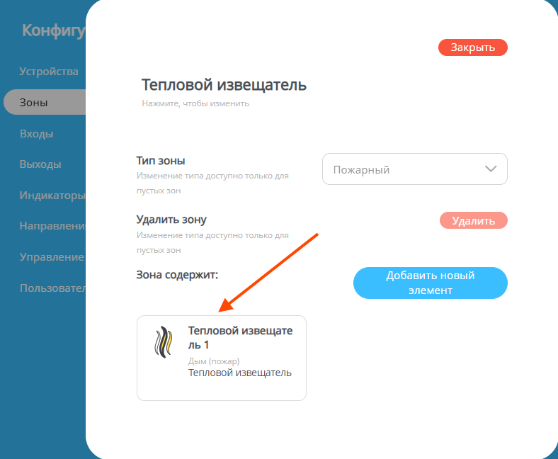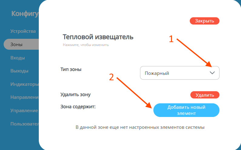Кнопка «Добавить новый элемент» откроет меню, в котором можно присвоить имя, ЗКПС и выбрать тип устройства. ЗКПС можно будет создать позже, так же как и привязать к ним извещатели.