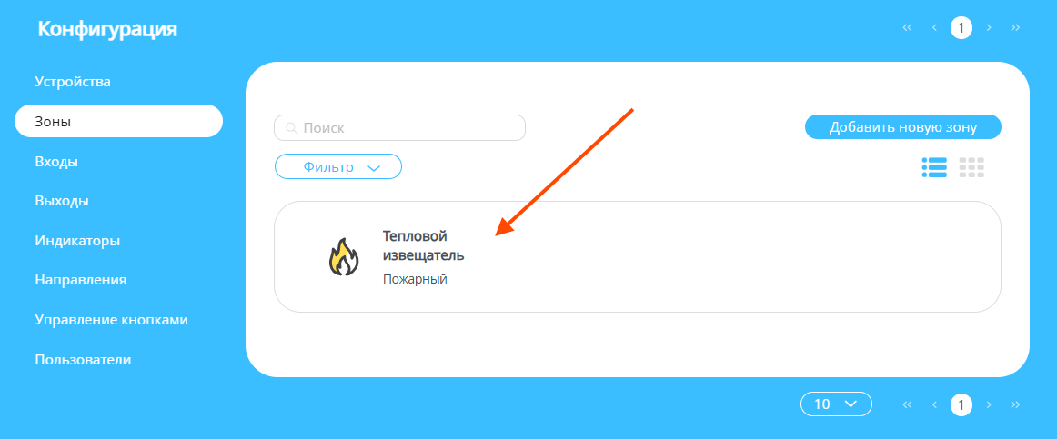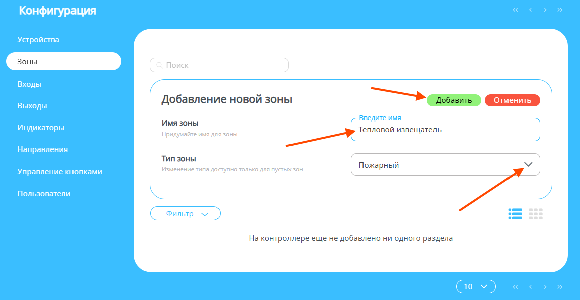 Выберите тип зоны, в нашем случае «Пожарный», назначьте имя зоны, нажмите кнопку «Добавить».