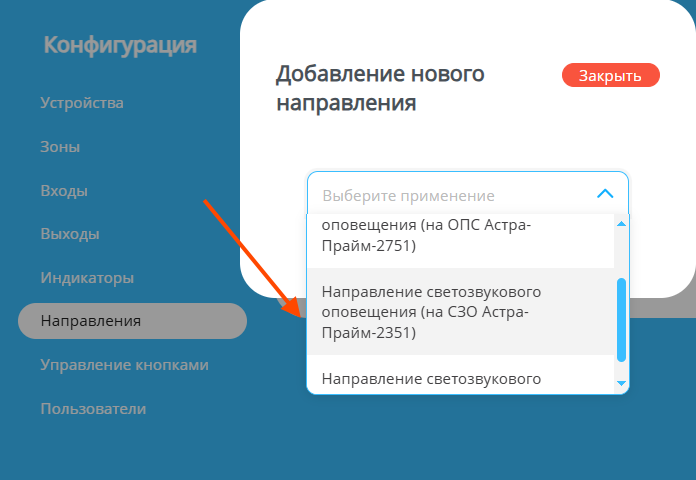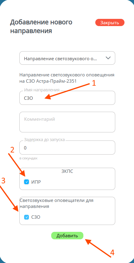 Присвойте имя направлению, далее выберите ЗКПС которые будут задействованы, выберите устройства из списка, нажимаем кнопку «добавить».