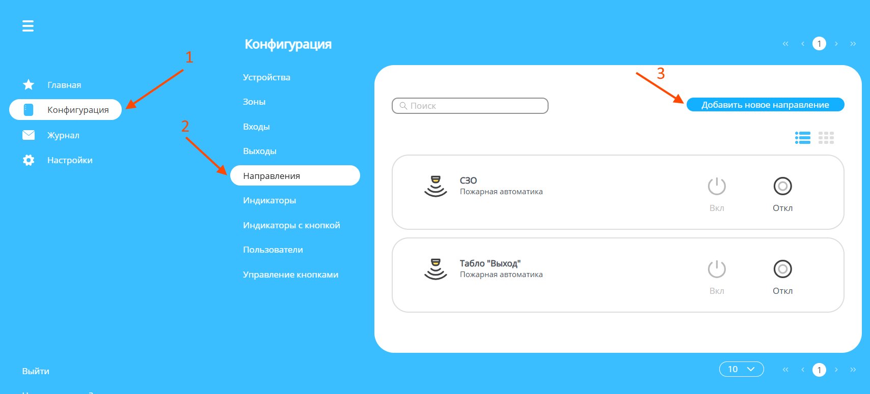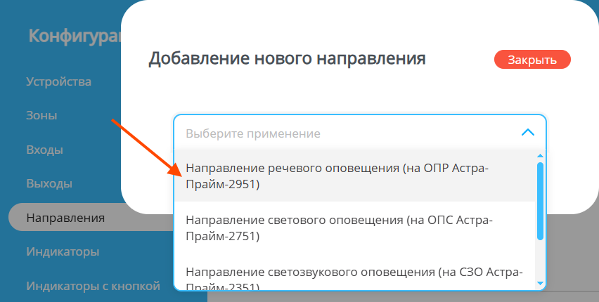 Присвойте имя направлению, далее выберите Зоны которые будут задействованы, выберите устройства из списка, выберите речевое сообщение, нажимаем кнопку «добавить».