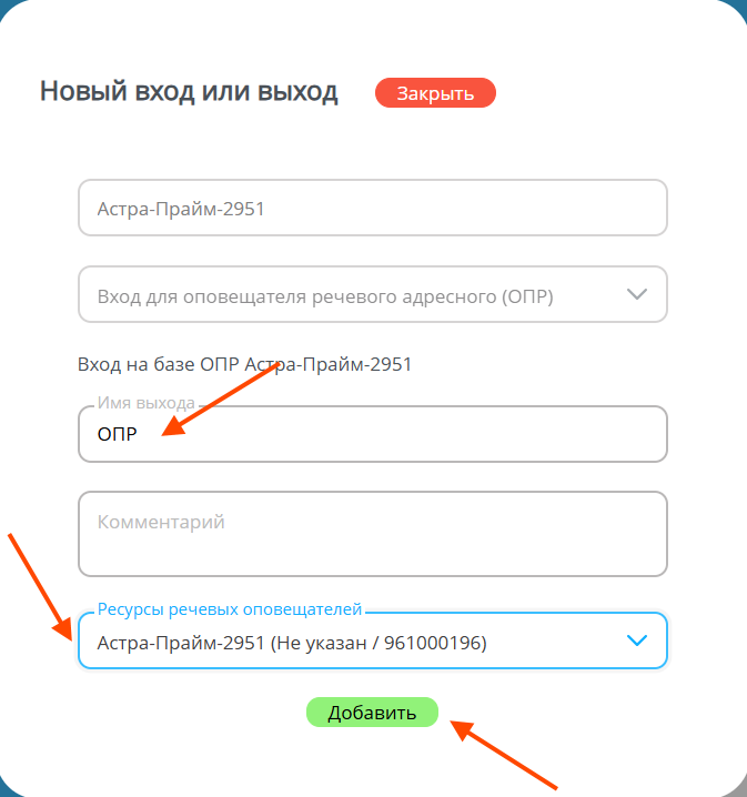 Укажите имя выхода, в нашем случае это СЗО Астра-Прайм 2351.