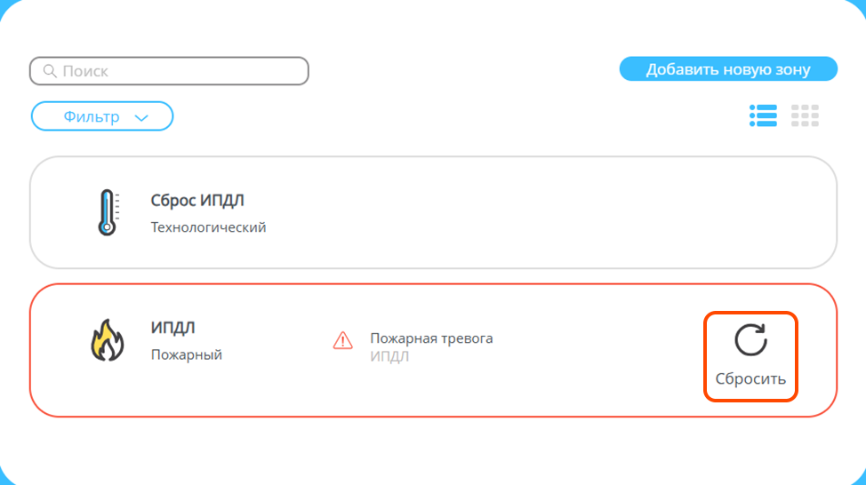 При возникновении сигнала «Пожар» нажмите на значок «Сбросить».