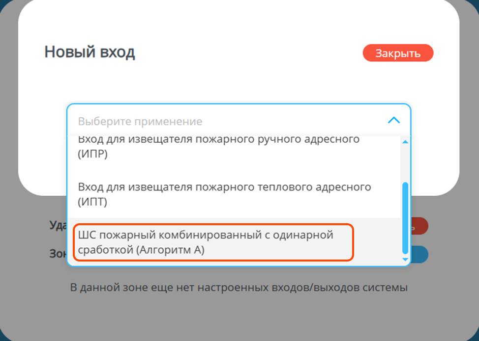 Выберите «ШС пожарный комбинированный с одинарной сработкой (Алгоритм А).