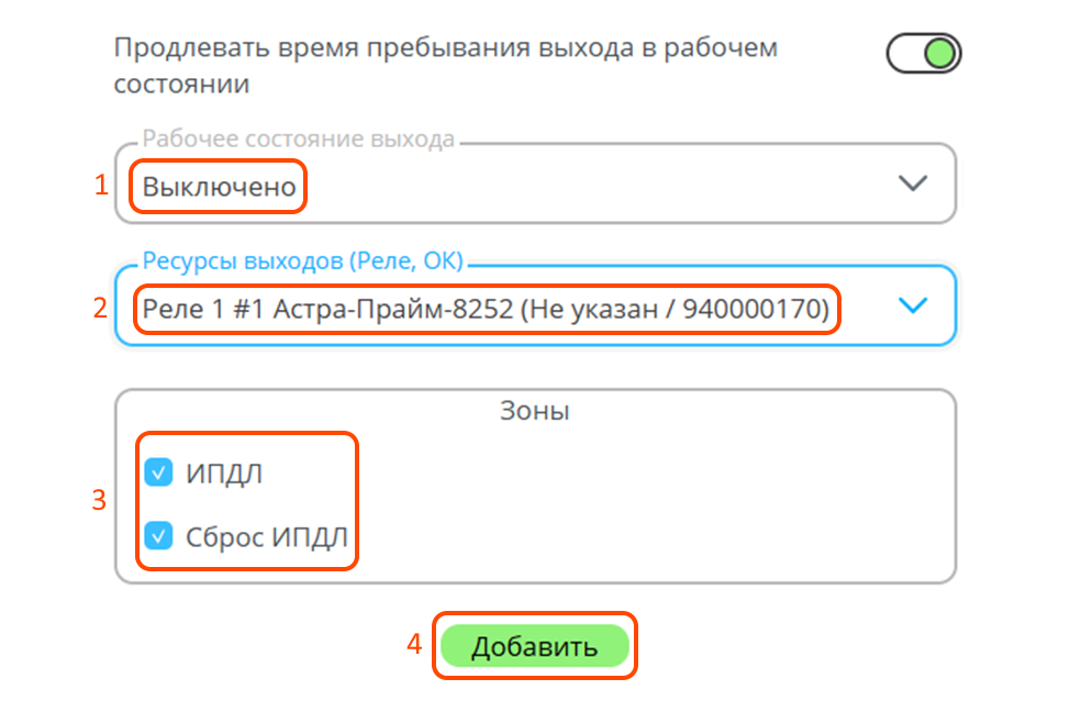 Подключение ИПДЛ-Д-1/4Р через модуль реле Астра-Прайм 8252.