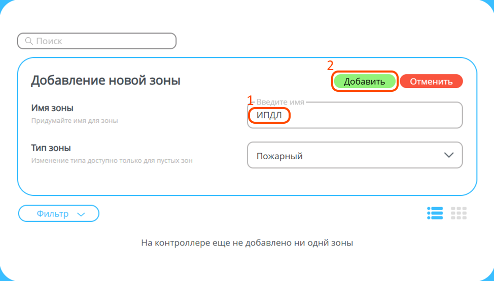 Введите имя зоны и выберите тип «Пожарный».