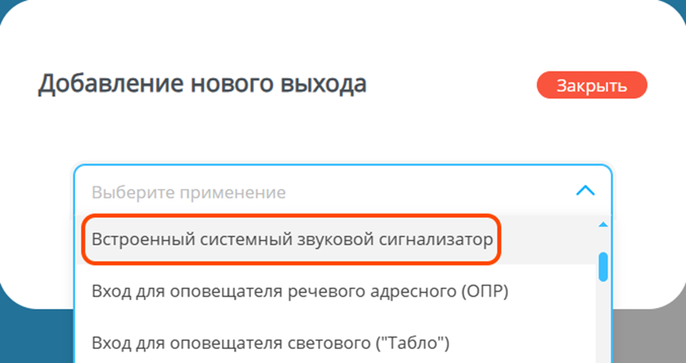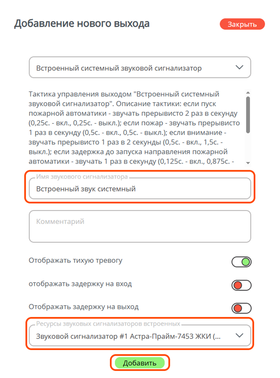 Выберите «Встроенный звуковой сигнализатор для зон и направлений пожарной автоматики».