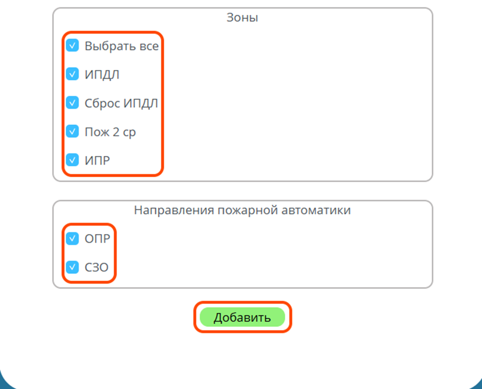 Далее выберите зоны и направления пожарной автоматики, с которыми будет работать встроенный звуковой сигнализатор.